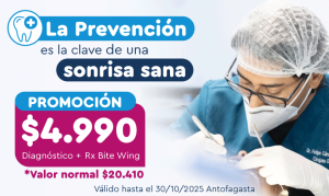 Agenda tu evaluación gratis hasta el 30 de octubre y obtén tu diagnóstico + RX Bite Wing por $4.990 valor normal $20.410, disponible solo en sucursales de ANTOFAGASTA.